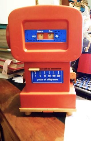 Bilancia giocattolo vintage degli anni '70, di colore arancione. - Display con indicazioni Peso Kg. e Importo Lira. - Scala graduata per il prezzo al chilogrammo. marca COMA (cas)