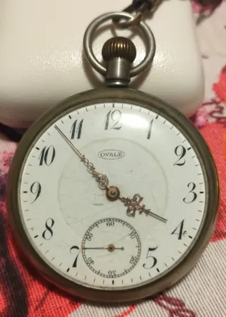 Orologio da taschino con quadrante bianco e numeri romani. Perfettamente funzionante. - Logo OVALE sul quadrante. - Quadrante secondario per i secondi. - Cassa in metallo.