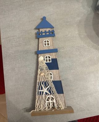 Deliziosa decorazione a forma di faro in stile nautico, perfetta per aggiungere un tocco marittimo alla tua casa. - Materiale: Feltro e legno - Dettagli: Rete da pesca, conchiglie e stella marina - Colore: Beige e blu