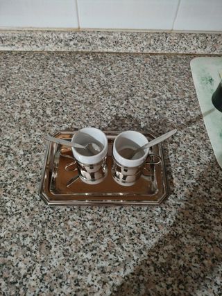 Vendo set da caffè in argento peso complessivo dell'argento 206g Il set comprende Un piattino d'argento Due cucchianini d'argento Due tazzine in ceramica con cover d'argento.
