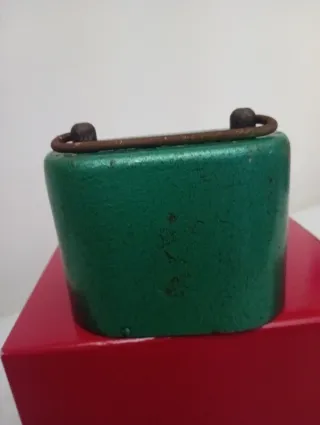 Salvadenaro in metallo verde con etichetta. Chiave non originale - Etichetta Cassa Rurale ed Artigiana S. Vito E S. Giustina di Rimini. -