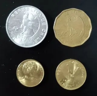 Set di 4 monete cilene. - 1 Peso, anno 1989 - 5 Pesos, anno 1989 - 10 Escudos, anno 1974 - 100 Escudos, anno 1974