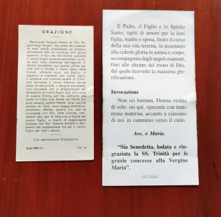 Una immagine raffigurante la statua di Maria SS. Assunta che si venera a Molinara (BN) più un santino dell'Assunzione di Maria Vergine.