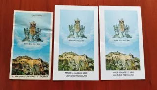 Tre santini raffiguranti la Madonna delle Armi venerata nel Santuario Cerchiara di Calabria (CS). Due sono in perfette condizioni, uno più antico presenta qualche difetto.