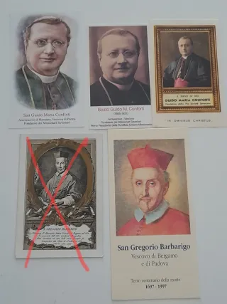 Tre santini raffiguranti l'immagine della chiesa di Alberobello (BA), dove viene venerato don Guanella. Una immagine più grande dell'urna col corpo del Beato, che si trova a Como.