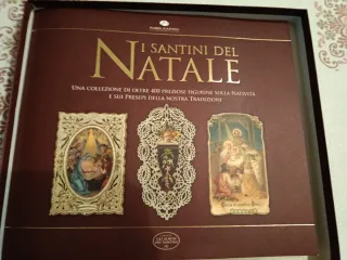 Vendesi due vecchi album contenenti santini religiosi. Uno ne contiene 198 e l'altro 213 40€ al pezzo - Album con copertina gialla e nera. - Album con copertina nera e bordi gialli. - Santini raffiguranti scene religiose e figure sacre.