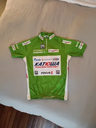 Maglietta da ciclismo del team Katusha, edizione speciale Critérium du Dauphiné del 2011. Progettata da Santini. Colore verde brillante. Loghi di Portes du Soleil, Gazprom, Ростехнологии, ITERA e Focus. Edizione limitata. Omaggio a Purito Rodríguez.