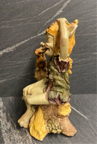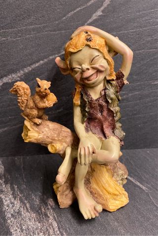 Deliziosa statuetta di un elfo seduto su un tronco d'albero con uno scoiattolo. - Dettagli finemente lavorati. - Personaggi in resina. - Ideale per collezionisti.