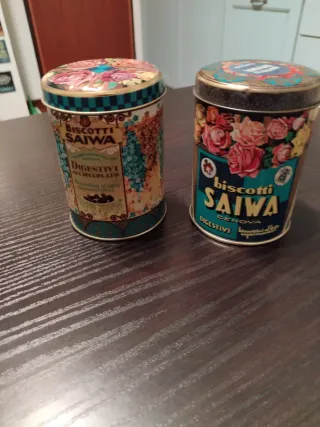 Due lattine vintage Saiwa, perfette per collezionisti. - Lattina Digestivi al Cioccolato. - Latta Digestivi Genova. - Decorazioni floreali e dettagli d'epoca. Misure: 10 x 7.5 cm.