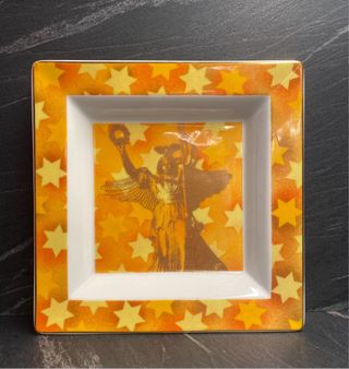 Piatto decorativo vintage Rosenthal con tema Berlino. Presenta un design con stelle gialle e arancioni e una figura alata al centro. - Design con figura alata e stelle. - Colori vivaci giallo e arancione.