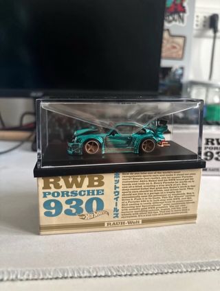 Modellino Hot Wheels RWB Porsche 930. - Dettagli in metallo color oro. - Verniciatura metallizzata verde acqua. - Design ispirato al tuning. - Base espositiva inclusa.