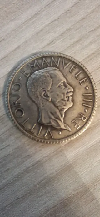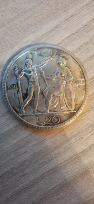 Moneta da 20 Lire raffigurante Vittorio Emanuele III. - Dritto: Effigie di Vittorio Emanuele III rivolta verso destra. - Rovescio: Stemma sabaudo coronato, con scudetto d'Angiò-Lorena. - Legenda: VITT. EM. RE. D'ITALIA e 20 LIRE.
