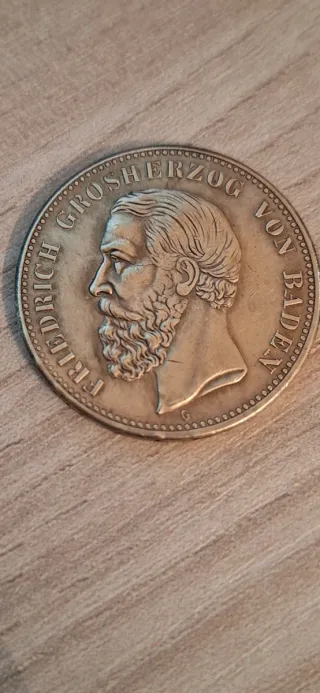 Moneta commemorativa del 1891 con il ritratto di Friedrich I di Baden. - Dritto: Ritratto di Friedrich I di Baden. - Anno: 1891 - Dicitura: FRIEDRICH GROSHERZOG VON BADEN