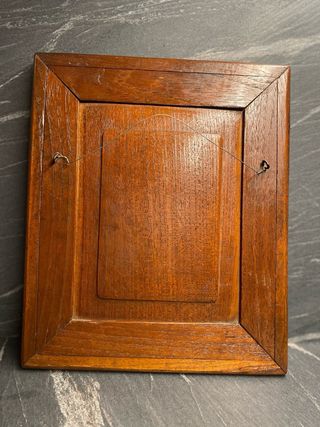 Bellissimo quadro vintage con piastrella in ceramica a rilievo. - Raffigurazione di un paesaggio orientale. - Cornice in legno scuro intarsiata.