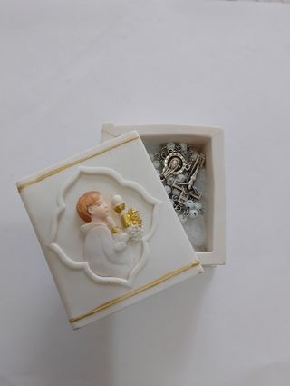 4 pezzi di questa scatolina prima comunione con confezione integra. idea regalo/bomboniera/oggettistica. Nuove, all'interno contiene un rosario. Con possibilità di venderle anche separatamente. €7 al pezzo.