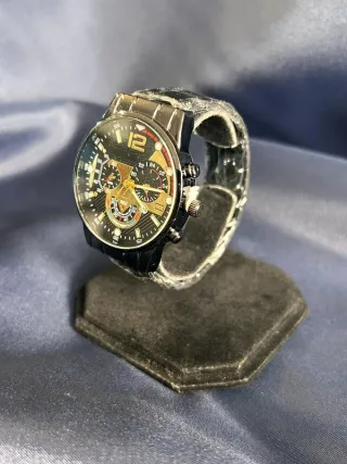 Orologio al quarzo dal design elegante e moderno, con scocca e cinturino full metal verniciati nero lucido, per un look raffinato e contemporaneo. Il quadrante nero è arricchito da dettagli dorati, che creano un contrasto sofisticato e di grande impatto visivo. Un accessorio ideale per chi cerca stile e personalità, perfetto per completare look eleganti o casual di classe. - Quadrante nero con dettagli dorati. - Movimento al quarzo. - Design moderno e accattivante.