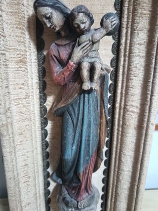 Antica scultura votiva raffigurante la Madonna con Bambino. - Realizzata in legno dipinto. - Dettagli finemente scolpiti. - Oggetto di devozione religiosa.