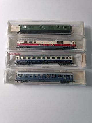 Lotto 4 carrozze scala N 3 MINITRIX 1 LIMA ottimo stato nessun segno di usura. Scatole MINITRIX, LIMA in scatola non originale.