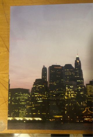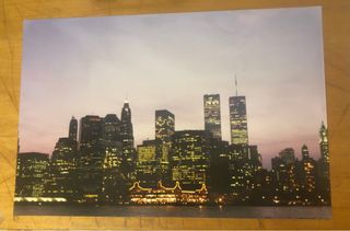 Poster foto originale anni ‘80/‘90 raffigurante lo skyline di New York City al tramonto con Twin Towers. Misura 30x45 cm - Vista iconica dei grattacieli. - Atmosfera suggestiva con luci accese.