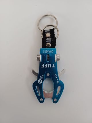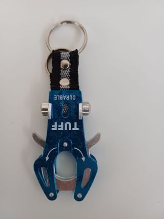 Portachiavi con moschettone decorativo in metallo blu con marchio "TUFF DURABLE". Presenta un doppio anello portachiavi in metallo e cordino in nylon resistente nero con dettagli grigi. La parte terminale riproduce la forma di un moschettone che può essere aperto per il suo utilizzo.