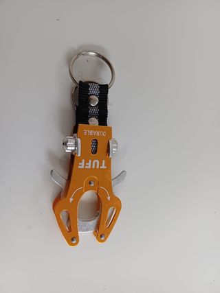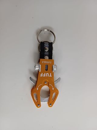 Portachiavi con moschettone decorativo in metallo arancione con marchio "TUFF DURABLE". Presenta un doppio anello portachiavi in metallo e cordino in nylon resistente nero con dettagli grigi. La parte terminale riproduce la forma di un moschettone che può essere aperto per il suo utilizzo.