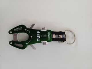 Portachiavi con moschettone decorativo in metallo verde con marchio "TUFF DURABLE". Presenta un doppio anello portachiavi in metallo e cordino in nylon resistente nero con dettagli grigi. La parte terminale riproduce la forma di un moschettone che può essere aperto per il suo utilizzo.