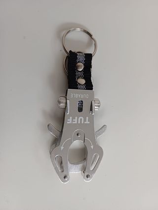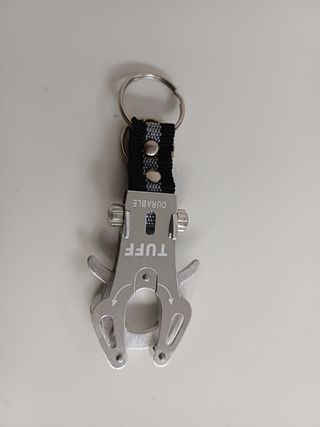 Portachiavi con moschettone decorativo in metallo grigio con marchio "TUFF DURABLE". Presenta un doppio anello portachiavi in metallo e cordino in nylon resistente nero con dettagli grigi. La parte terminale riproduce la forma di un moschettone che può essere aperto per il suo utilizzo.
