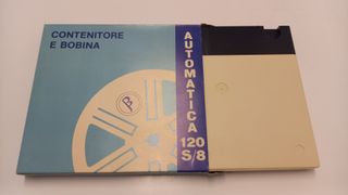 contenitore vintage per bobine di pellicola cinematografica amatoriale, specificamente progettato per formati 8mm o Super 8. • Contenuto: Progettato per proteggere e conservare bobine di film. • Formato: Compatibile con pellicole 8mm o Super 8, formati storici popolari per il cinema domestico. • Caratteristiche: Il design include una custodia rigida e un meccanismo di caricamento automatico (indicato dalla scritta "Automatica") per facilitare l'uso con i proiettori dell'epoca