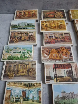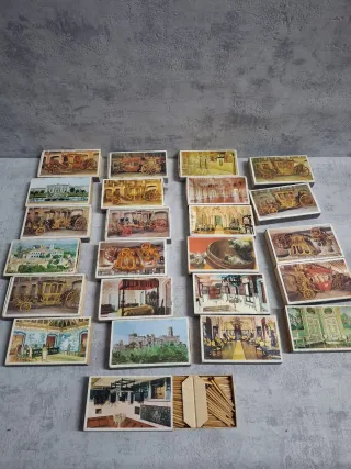 Set di scatole di fiammiferi antiche con illustrazioni di carriaggi e scene storiche. Design vari di carriaggi e palazzi. Ideale per collezionisti. Include scatola con fiammiferi.