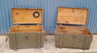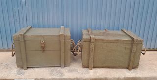 Scatole militari in legno, originali e in ottime condizioni. Una scatola misura 60 cm di larghezza, 42 cm di altezza e 37 cm di profondità. L'altra misura 64 cm di larghezza, 40 cm di altezza e 40 cm di profondità. Prezzo per unità.