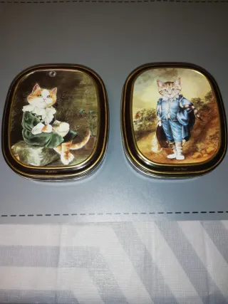 Set di due scatole metalliche antiche con design di gatti. - Design Bubbles sulla scatola sinistra. - Design Blue Boy sulla scatola destra. - Formato ovale con bordo dorato.