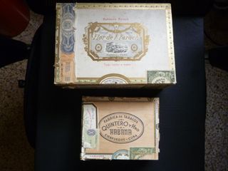 In vendita due scatole antiche di Habanos. - Scatola di Farias Superiores 100% Tabacco. - Scatola di H. Upmann Habana Made in Havana-Cuba. Entrambe le scatole includono avvisi sanitari. Sono scatole vintage. Una è di cartone e l'altra di legno.