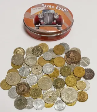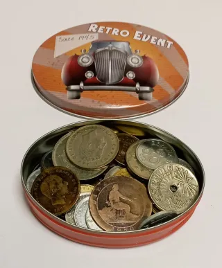 Lotto composto da 65 monete antiche spagnole + Scatole di metallo, vari anni e stati di conservazione, usate, circolate. Quelle visibili nella foto. Spedizioni tramite Wallapop.