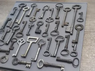 Set di chiavi antiche con design vari, perfette per collezionisti o decorazione: mobili, porte, scatole, lucchetti, valigie... - Varietà di dimensioni e forme. Bella patina. Circa 30 chiavi in totale.