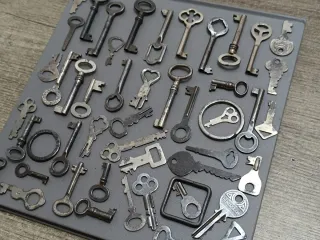 Set di chiavi antiche di diverse dimensioni e design: mobili, scatole e lucchetti.
