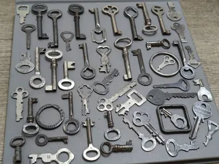 Chiavi antiche di diverse dimensioni e design: mobili, lucchetti, porte e scatole. Pezzi decorativi o da collezione.