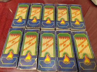 In vendita lotto di 10 scatole di fiammiferi di sicurezza. - Design con fiamma e legna. - Ogni scatola contiene fiammiferi di sicurezza. Funzionano.