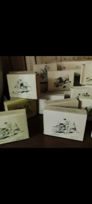 Set di scatole di fiammiferi vuote con illustrazioni. Ogni scatola presenta una scena taurina. Design vari di toreri e tori. Ideali per collezionisti o artigianato. 29 unità.