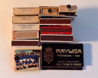 Consegna di scatole di fiammiferi vintage spagnole (anni '60-'80). Include pubblicità e design retrò: – Bar Kavuga Polynesian (Barcellona) – Celtas – Fosforera Española – Gary Numan – motivi artistici e turistici Ideali per collezionismo, decorazione o accessori retrò. Stato vintage con segni del tempo. Si vendono insieme.