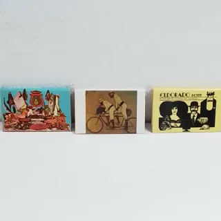 Set di tre vecchie scatole di fiammiferi con diverse illustrazioni. - Dimensioni approssimative: 8 x 5 cm ciascuna. - Un'illustrazione di un chiosco di cibo su una scatola. - Un'illustrazione di due persone in bicicletta su un'altra. - Un'illustrazione di figure eleganti e il testo ELDORADO PETIT sulla terza. OGNI x 4€