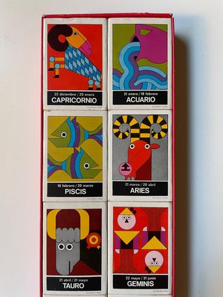 Cofanetto di scatole di fiammiferi vintage della serie Zodiaco progettato dal grafico spagnolo Cruz Novillo nel 1968 per il marchio Fósforo del Pirineo. 12 Scatole di fiammiferi. Collezione completa. Piene e con i raschietti in perfetto stato. Protette all'interno di un astuccio pubblicitario per prodotti di profumeria maschile Lucky. L'astuccio è usurato. Le scatole di fiammiferi, essendo protette, si trovano in perfetto stato. Altre scatole di fiammiferi da collezione nel mio profilo.