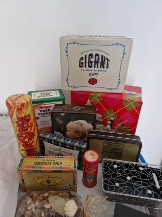 Raccolta di varie scatole metalliche con design vintage anni '70. - Scatola rettangolare di Cola Cao con stampa floreale blu e verde. - Scatola alta Cola Cao senza coperchio, stampa riso. - Scatola rotonda di Nesquik con design floreale in toni rosa e viola. - Scatola metallica di tè Twinings. - Latta rossa con stelle gialle e logo Mahou.