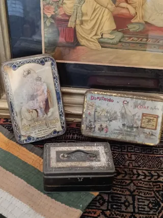 Set di 11 scatole di latta antiche, ideali per collezionisti. Si vendono anche singolarmente e si accettano offerte - Scatola di compresse di garza sterilizzate a 134º - Scatola La Belleza Super-Redondos - Scatola Romeo y Julieta Habano - Scatola Cigarritos Ducados Capa Sumatra - Scatola Henri Wintermans Café Crème - Scatola Lofthouse's Original Fisherman's Friend - Scatola Armor - Scatola Café Creme - Scatola Vigarros Alvaro - Scatola Sacacorchi - Scatola Carré de Guajanae