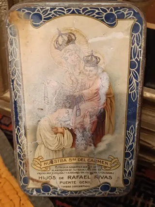 Set di tre scatole di latta antiche con design vintage. - Scatola con immagine religiosa di Nostra Signora del Carmine. - Scatola Dimitrino & C° con scena di navi. - Piccola scatola metallica con maniglia.