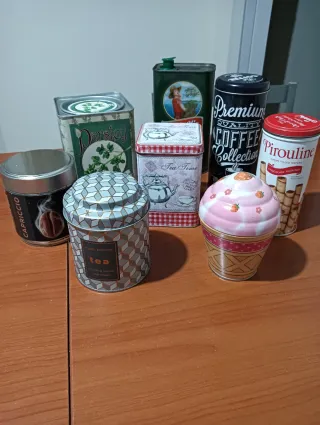 Set di8 scatole di latta decorative, perfette per conservare oggetti o come elementi d'arredo. - Scatola verde con immagine di bambina e scritta Olio. - Scatola quadrata Tea Time con motivo a scacchi rossi. - Scatola cilindrica con disegno geometrico grigio e bianco. - Scatola a forma di cono gelato rosa con fragole. - Scatola nera Premium Coffee con scritte bianche. - Scatola cilindrica Pirouline con wafer. - Scatola quadrata con disegno floreale verde e bianco.