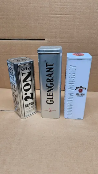 Set di tre scatole di latta a tema whisky. - Scatola Jack Daniel's con design charcoal mellowed. - Scatola Glengrant con immagine della bottiglia. - Scatola Jim Beam con sigillo rosso e logo B.