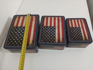 Set di tre scatole decorative in latta con stampa della bandiera americana. - Design a tema Stati Uniti d'America. - Chiusura a lucchetto. - Finitura effetto vintage. Set 3 Scatola in Latta Bandiera Americana Stati Uniti D'America Usa Vintage come nuove