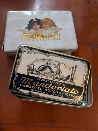 Due scatole vintage in latta, perfette per collezionisti o come elementi decorativi. Nel prezzo comprese entrambe - Scatola Fiorucci con disegno di angeli. - Scatola Mandorlato con disegno d'epoca e gondola.