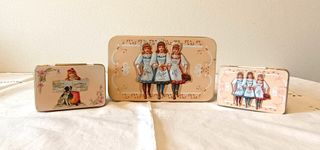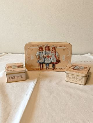 Set di quattro scatole vintage in latta, perfette per conservare oggetti. - Design decorato con illustrazioni di bambini. - Colori pastello assortiti.