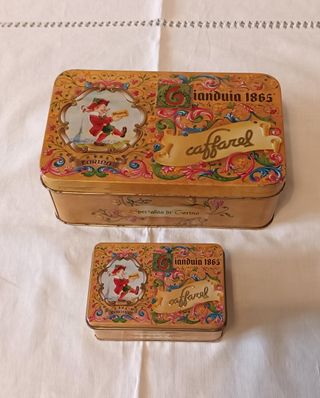 Scatole in latta rettangolari degli anni '90 che contenevano cioccolatini prodotti dalla Caffarel (fondata a Torino nel 1826 da Pier Paul Caffarel). La scatola piccola ha il coperchio incernierato. In ottime condizioni. > Scatola grande: cm. 17 x 10 x 6 - € 15,00 > Scatola piccola: cm. 9 x 6 x 3,5 - € 5,00